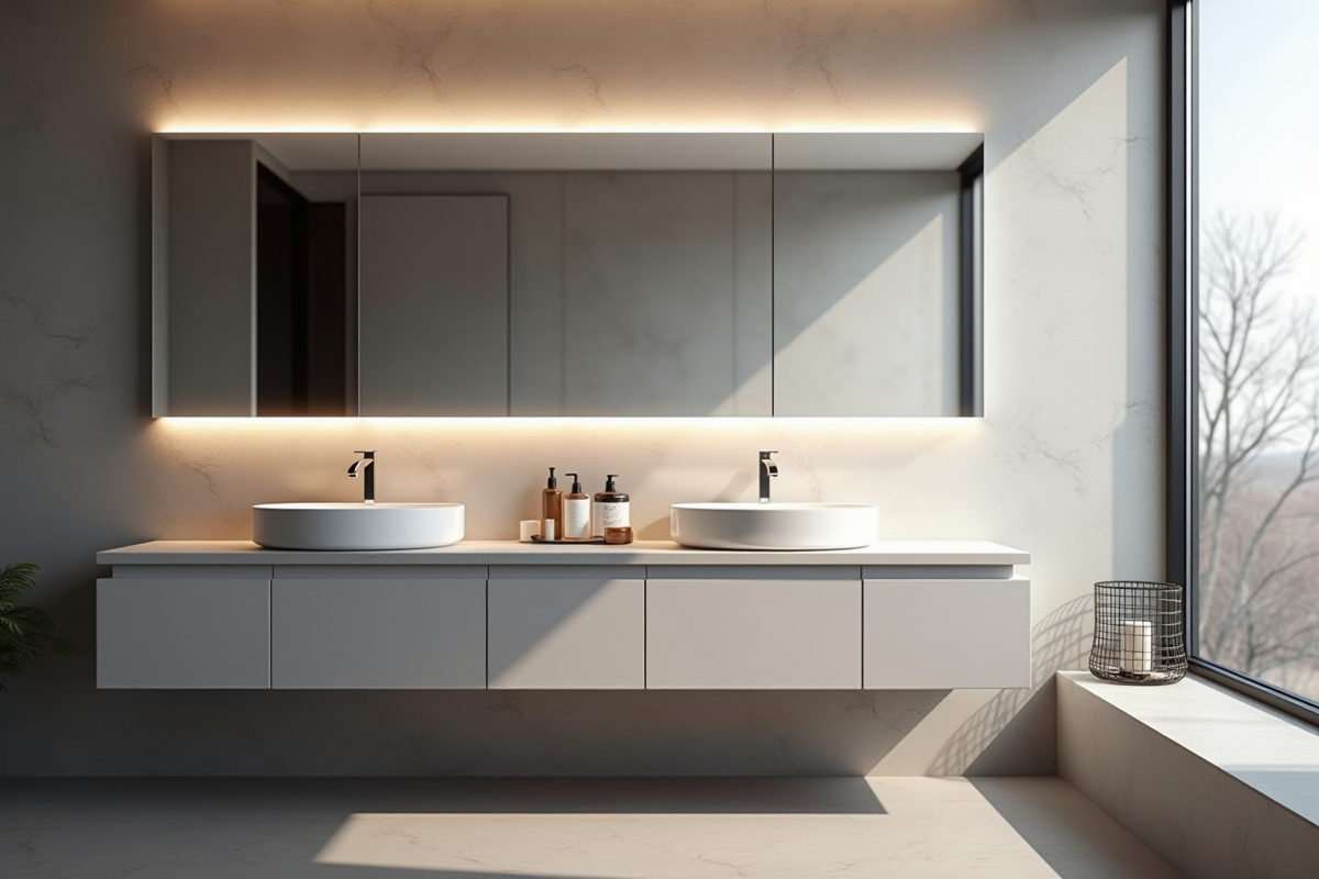 Le miroir, élément incontournable, doit se placer à environ 20 cm au-dessus de la vasque. Il est aussi fondamental d’adapter cette hauteur à celle des robinets pour éviter toute gêne visuelle et garantir une utilisation aisée.