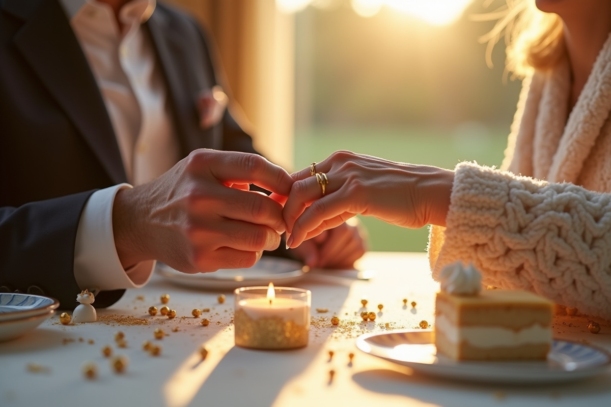 Parmi les pistes les plus appréciées, le renouvellement de vœux prend une dimension particulière. Ce rendez-vous, solennel ou décontracté, réunit enfants, petits-enfants, amis de toujours autour du couple. On partage rires, souvenirs, anecdotes, parfois un nouvel échange d’alliances en vermeil pour souligner la symbolique du jour.
